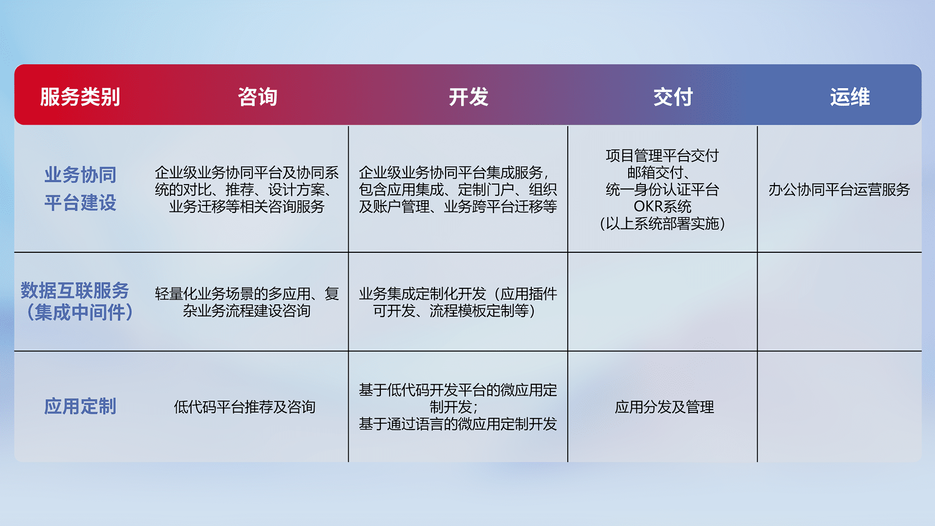 针对钉钉、、、企微、、、、IDaas等平台级产品提供产品的规划、、方案、、、、交付、、定制化开发等服务,,实现如统一协同办公、、、智能客户服务、、混合会议管理、、、、智能数据查询、、、、等业务场景,,,,实现数字化转型。。。。