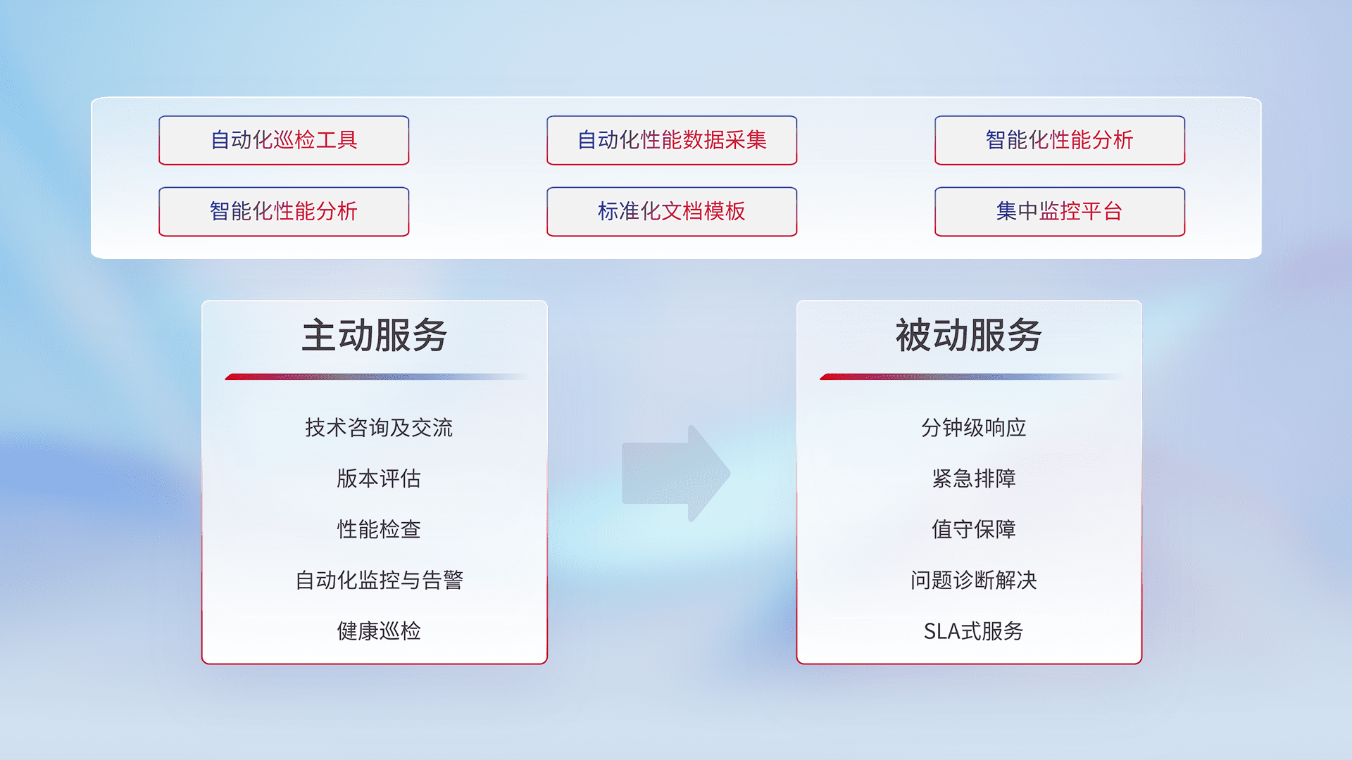 智能化工具和标准化文档,,保障服务质量,,,,提供主动服务(包含技术咨询、、、、版本评估、、、、性能检查、、、自动化监控与告警、、健康巡检)和被动服务包含(分钟级响应、、、、紧急排障、、值守保障、、、问题诊断解决、、、、SLA服务)。。